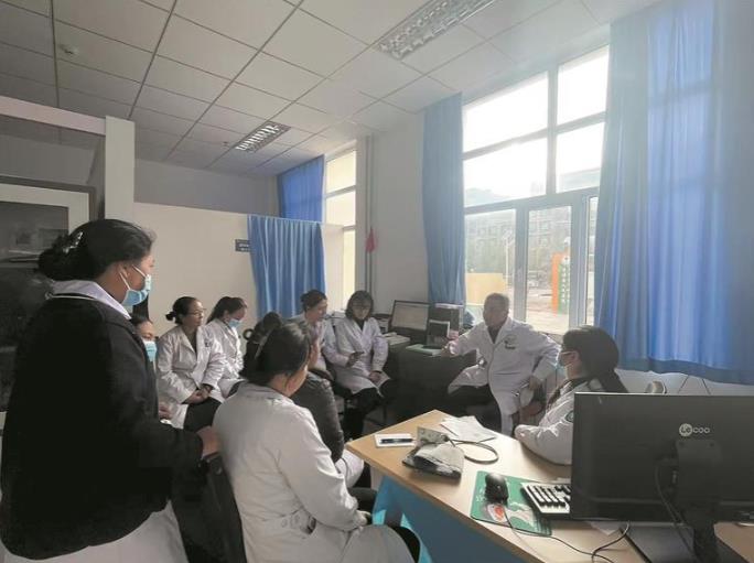 在囊谦县人民医院的远程会诊中心内,梁海峰正带着院里的骨干医生与首都医科大学附属复兴医院进行一场跨越千里的“云端”培训。培训结束后,顾不上休息,梁海峰又快步来到内科诊室,此时门外已有很多等候的患者。