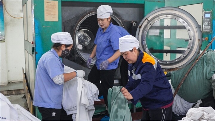 随着包裹被装车运走,记者也开启了第二个环节的工作——洗。你以为打包分类好的卧具来到洗涤班组就可以直接清洗了?不,还有工序,点数、人工再次分拣。分拣后,污渍较少的可以直接送到洗涤区,先用凉水预洗再加入洗涤剂用热水洗涤;沾了饭菜油渍、污渍严重的还要用手一遍遍清洗才行。在第二位师傅的指导下,记者戴好鞋套将污渍较少的卧具依次投入到洗衣机内洗涤,洗涤后的卧具还要进行熨烫,师傅手把手教记者,如何将洗涤后的卧具放入熨烫机,记者小心翼翼,不敢伸手太快就怕被高温烫伤,一时之间手忙脚乱。好不容易完成了卧具的熨烫,最后一道工序就是折叠和分类。别看在家也干过家务,但真正折叠起来也是有技巧的,不仅要折好、还需要分辨卧具的用途进行分类打包,独自完成一个包裹的打包后,记者的工作服早已湿透。