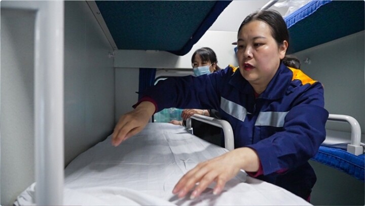20年的从业经历,练就了马占梅得心应手、快速熟练的装卧具功底。从早上六点上班,马占梅需要和同事们马不停蹄地工作,一刻不得休息。平峰期,两个人每天至少要完成10节车厢的工作,遇到暑运、春运高峰期,最多的时候给22趟车的卧铺装好卧具,一天下来,人已累到虚脱。