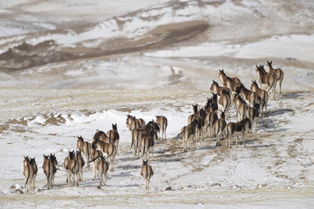 黄昏时分,一群藏野驴把我们从对野牦牛的注视中拉开。它们正在一片宽阔的河谷低头吃草,看到车队便迅速朝对面山坡跑去,到半山腰又齐齐停下,回头静静望向我们。夕阳把它们的轮廓镀上一层金边,河谷里一时只剩下风声。