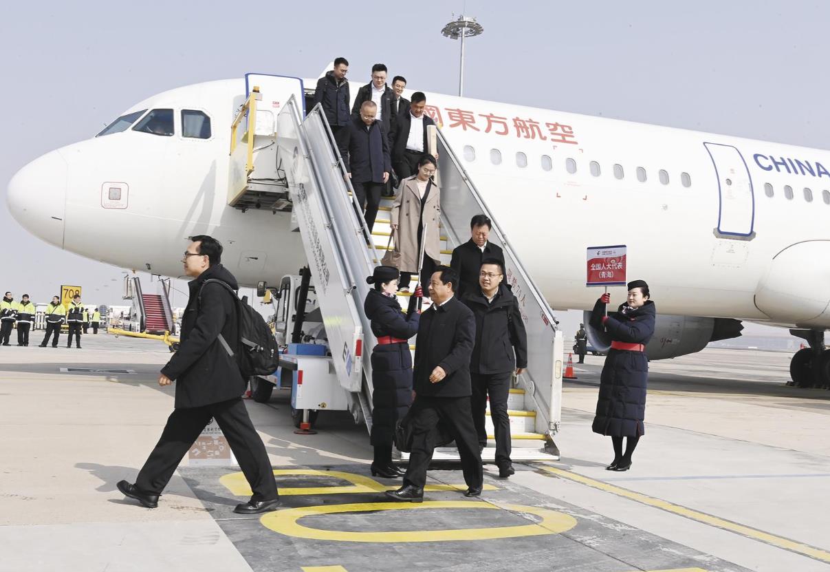 3月3日,出席十四届全国人大四次会议的青海代表团顺利抵达北京,向大会报到。