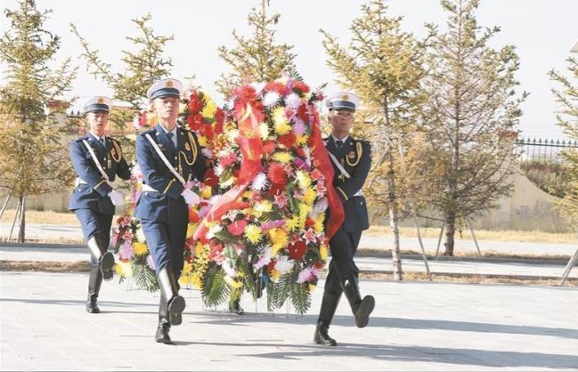 同一时间,青海省海北藏族自治州刚察县烈士陵园内,蓝焰国旗护卫队10名礼兵,扶托着花篮,分列于碑前广场两侧。《义勇军进行曲》奏响,全体人员肃立致敬,齐唱国歌,激昂的歌声在陵园上空久久回荡。