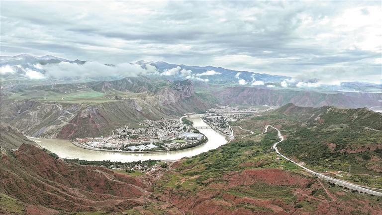 深秋的一场雨后,次日清晨,天空逐渐放晴,红色的山脊上环绕着白云,山腰处是绿得通透的天然林。车子驶近拉加镇黄河谷地时,一道碧绿的S形水湾跃入眼帘——黄河在这里放缓了脚步,温柔地环抱这片肥沃的土地。