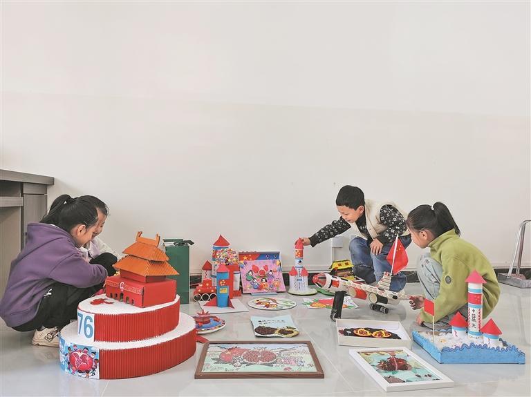 孩子们在一起学习研究其他同学手工制品。白力阁 摄