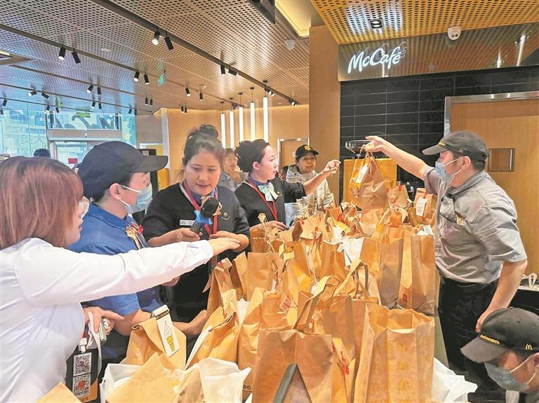 麦当劳店内工作人员正紧张有序地打包餐品,堆满桌面的纸袋彰显出开业首日的火爆消费需求。