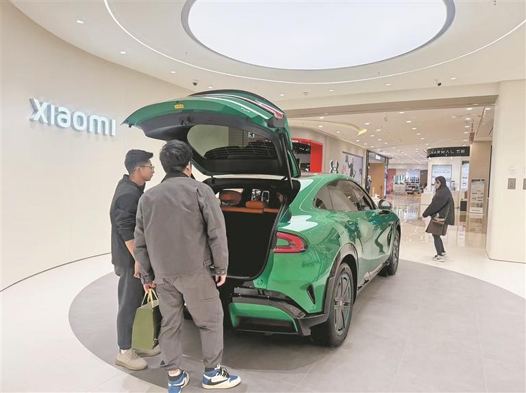 小米门店内,消费者围绕展车向工作人员咨询小米汽车相关信息。