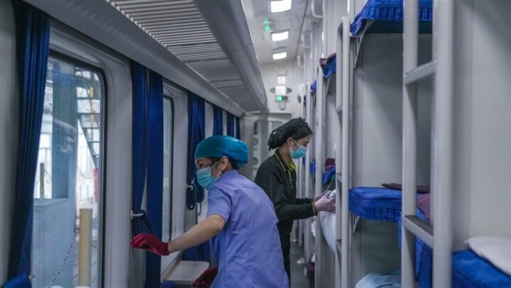在检查完着装后,记者跟随临时师傅开启了第一个环节的工作——拆。拆的内容包括床单、被套、枕套(以下简称“卧具”)。春运期间,通常一列火车有19节车厢,其中包含5节硬座车厢、9节至10节硬卧车厢、1节至2节软卧车厢,以及1节餐车。以硬卧为例,每节车厢有66个铺位,记者的工作就是在列车到达“临时旅店”后登上列车,将硬卧、软卧铺位上旅客已经用过的卧具全部拆下来,并且在拆的过程中还要进行分类,为第二个环节作准备。