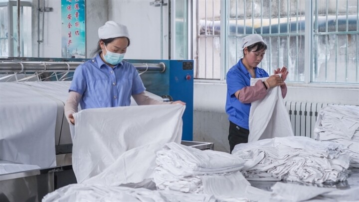随着包裹被装车运走,记者也开启了第二个环节的工作——洗。你以为打包分类好的卧具来到洗涤班组就可以直接清洗了?不,还有工序,点数、人工再次分拣。分拣后,污渍较少的可以直接送到洗涤区,先用凉水预洗再加入洗涤剂用热水洗涤;沾了饭菜油渍、污渍严重的还要用手一遍遍清洗才行。在第二位师傅的指导下,记者戴好鞋套将污渍较少的卧具依次投入到洗衣机内洗涤,洗涤后的卧具还要进行熨烫,师傅手把手教记者,如何将洗涤后的卧具放入熨烫机,记者小心翼翼,不敢伸手太快就怕被高温烫伤,一时之间手忙脚乱。好不容易完成了卧具的熨烫,最后一道工序就是折叠和分类。别看在家也干过家务,但真正折叠起来也是有技巧的,不仅要折好、还需要分辨卧具的用途进行分类打包,独自完成一个包裹的打包后,记者的工作服早已湿透。