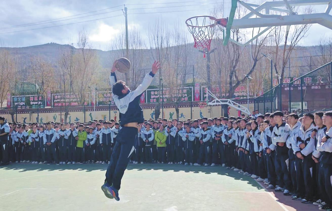 4月7日下午,黄南藏族自治州同仁市第一民族中学的篮球场上,里三层外三层围满了学生。挤进去一看,篮球特色班的几个高个子男生正在练习扣篮——加速,跃起,球狠狠砸进篮筐,整个篮板都在颤动。